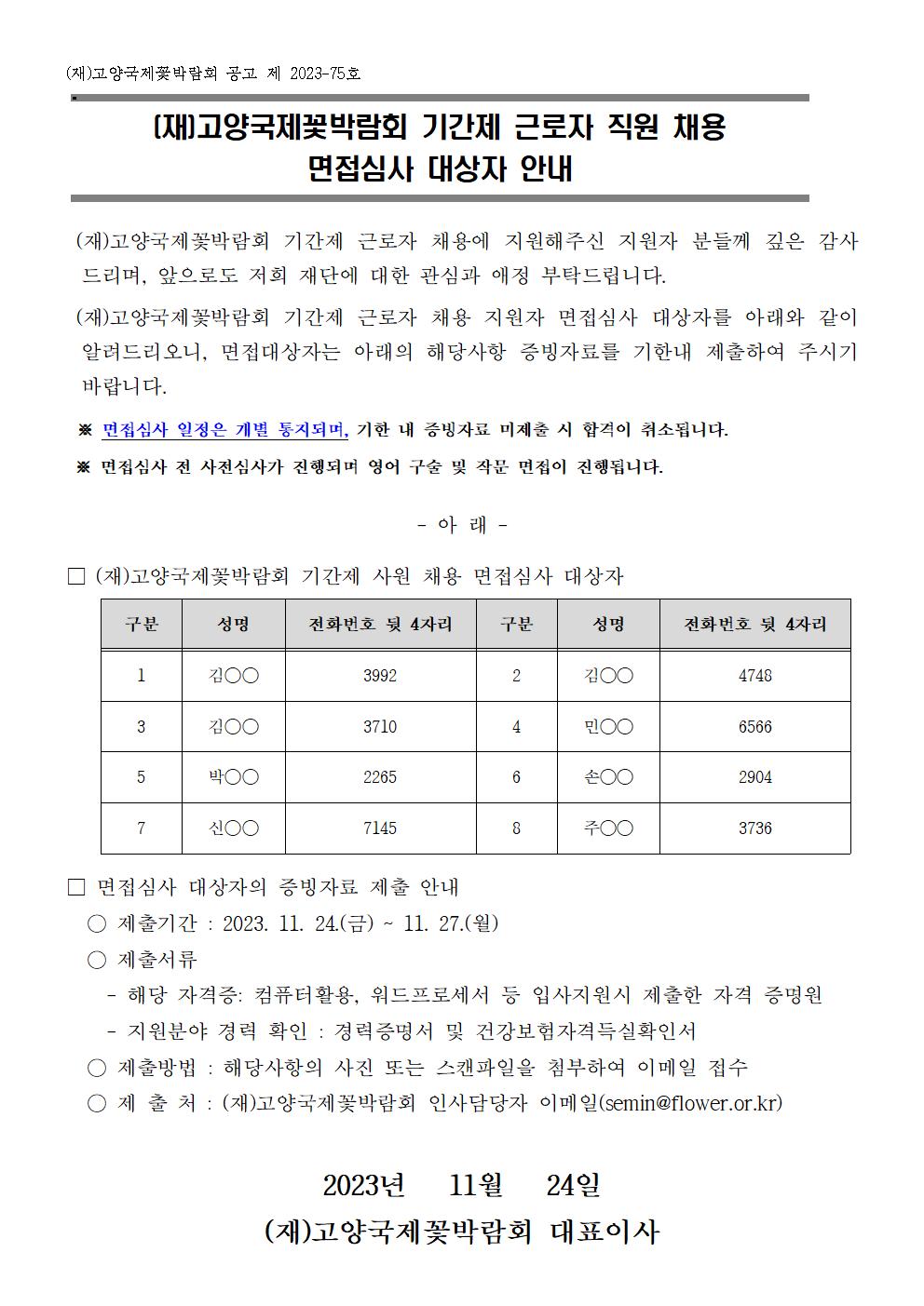(재)고양국제꽃박람회 기간제 근로자 채용 면접심사 대상자 안내