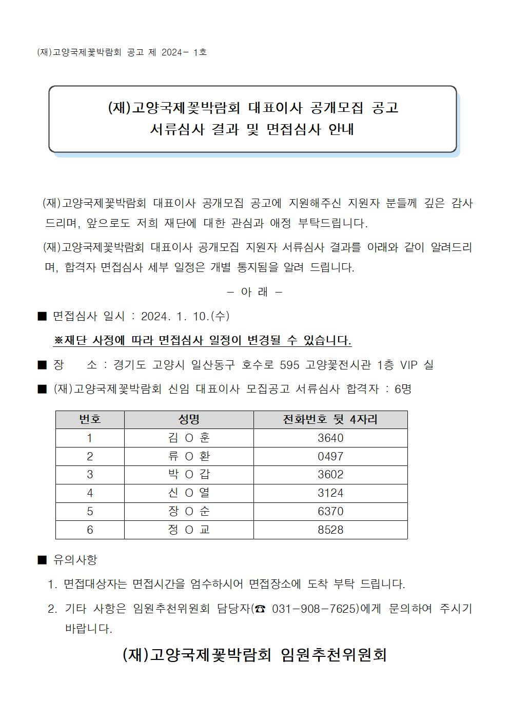 (재)고양국제꽃박람회 대표이사 공개모집 공고 서류심사 결과 및 면접심사 안내
