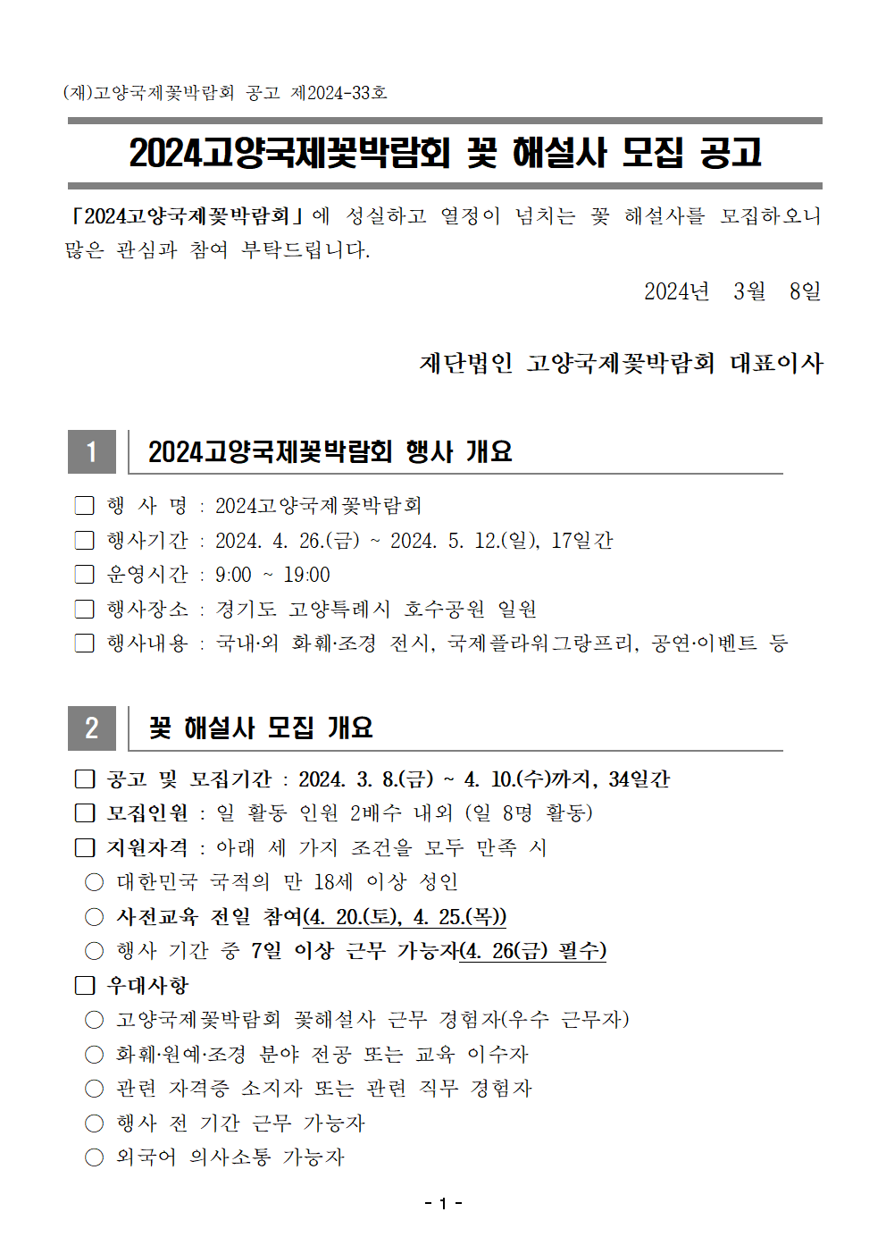 2024고양국제꽃박람회 꽃 해설사 모집 공고