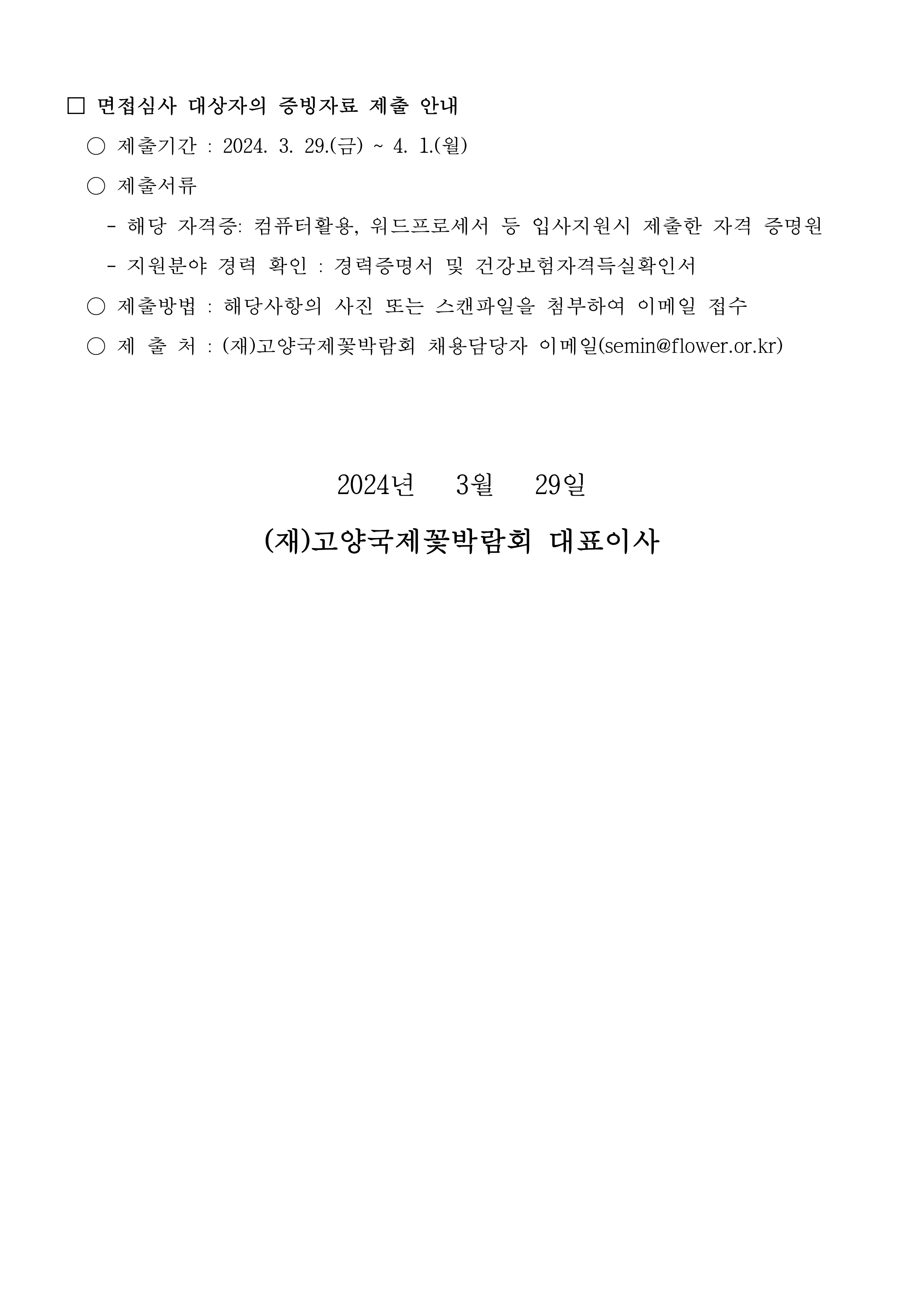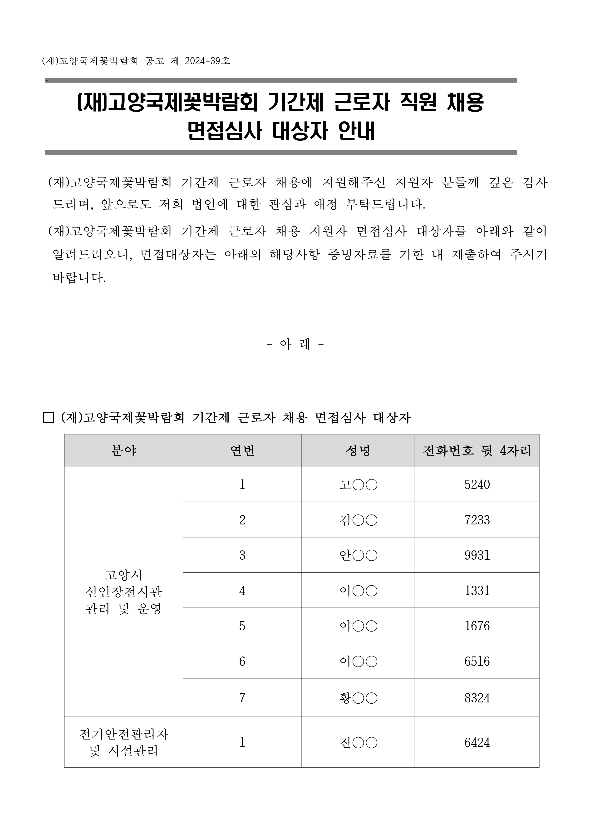 (재)고양국제꽃박람회 기간제 근로자 채용 면접심사 대상자 안내 공고 건의