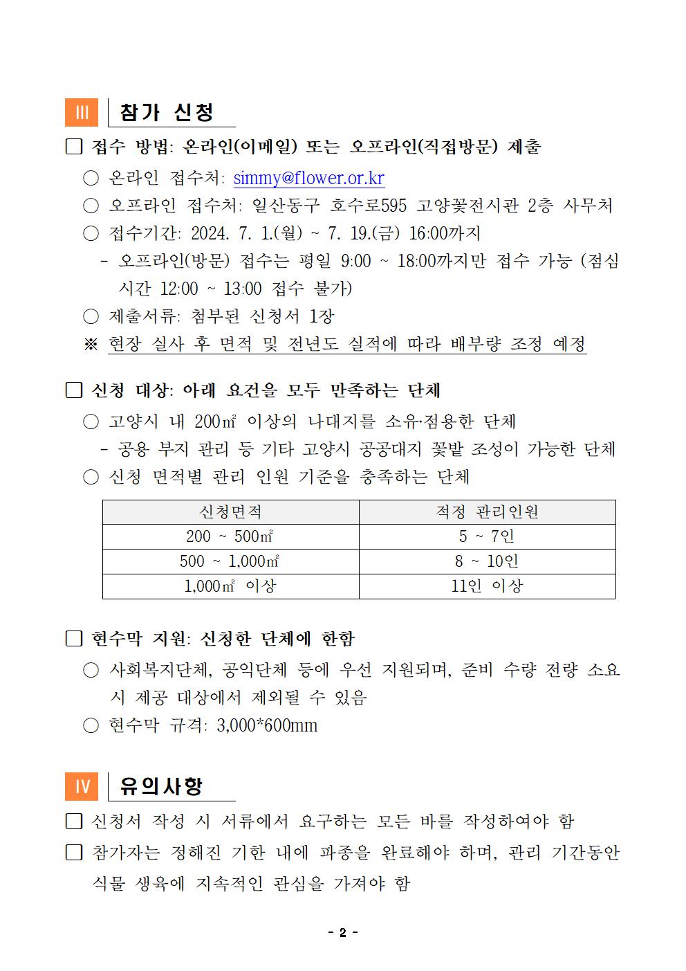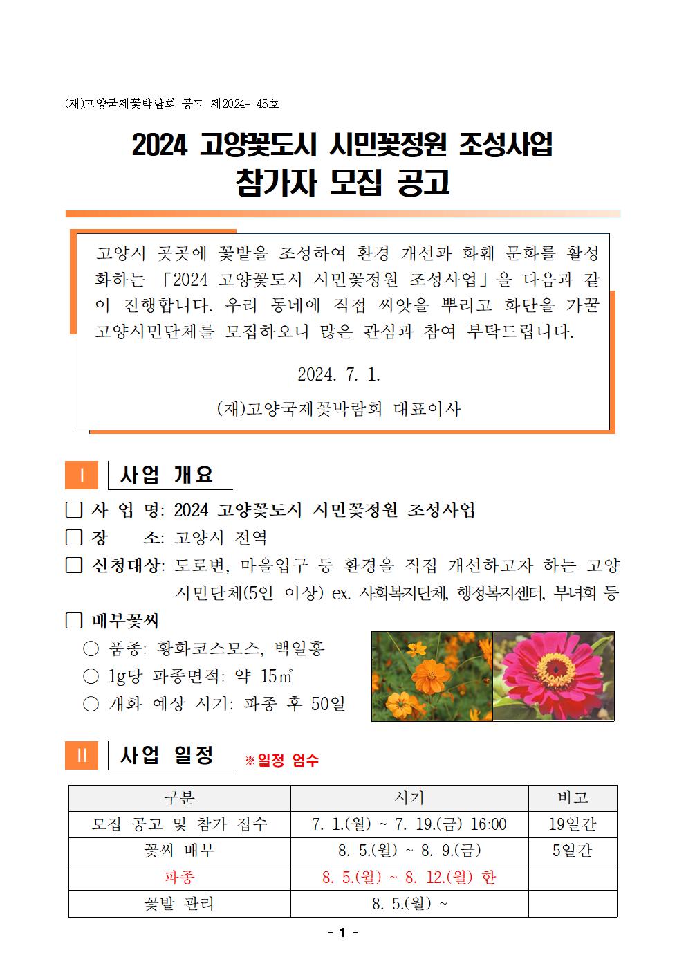2024 고양꽃도시 시민꽃정원 조성사업 참가자를 모집합니다. 자세한 내용은 아래 공고문을 확인하시기 바랍니다.