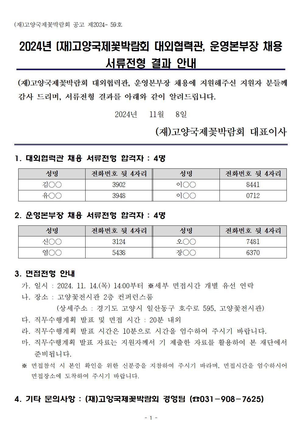 2024년 (재)고양국제꽃박람회 대외협력관, 운영본부장 채용 서류전형 결과 안내