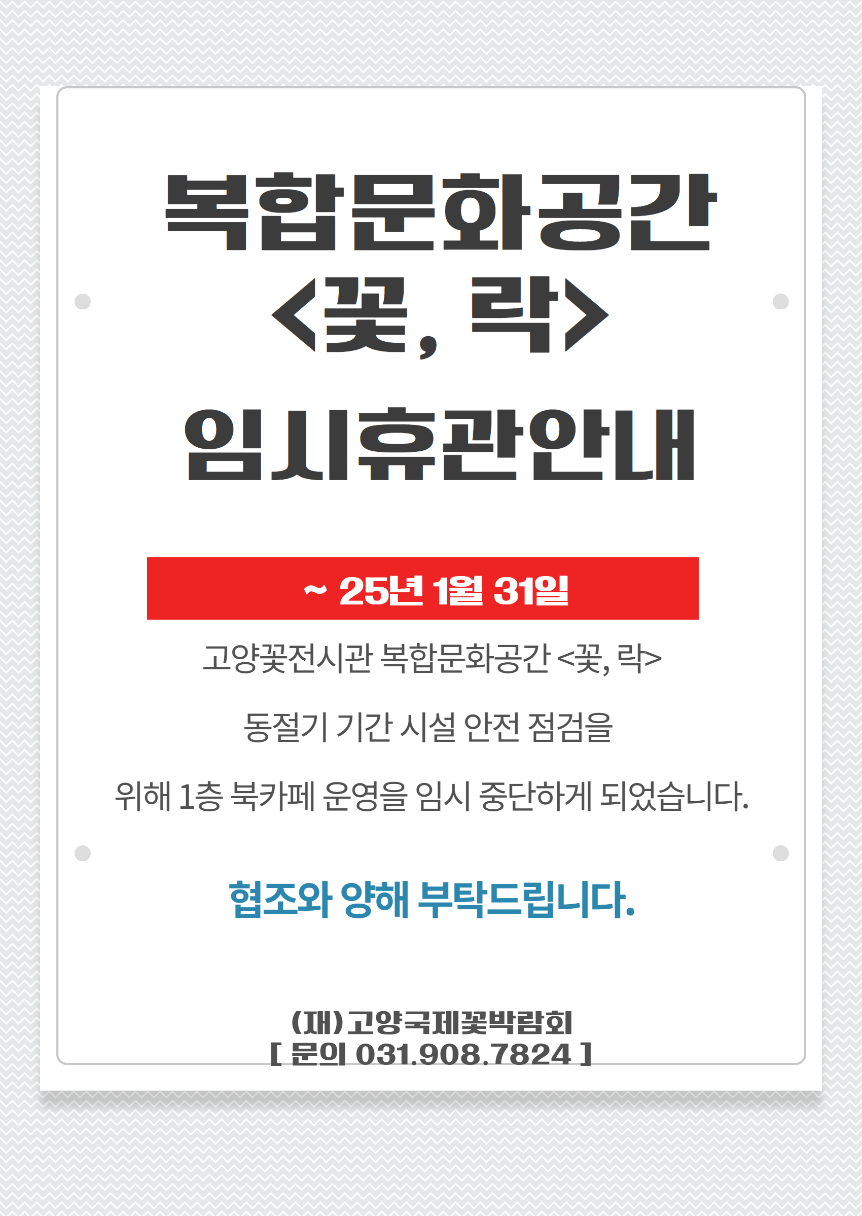 고양꽃전시관 1층 복합문화공간 <꽃, 락>에 동절기 시설 안전점검 사유로 임시 휴관을 시행 합니다.