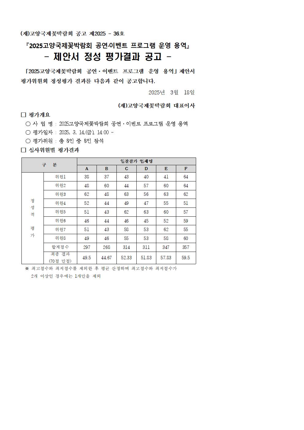 2025고양국제꽃박람회 공연·이벤트 프로그램 운영 용역 제안서 정성 평가결과 공고