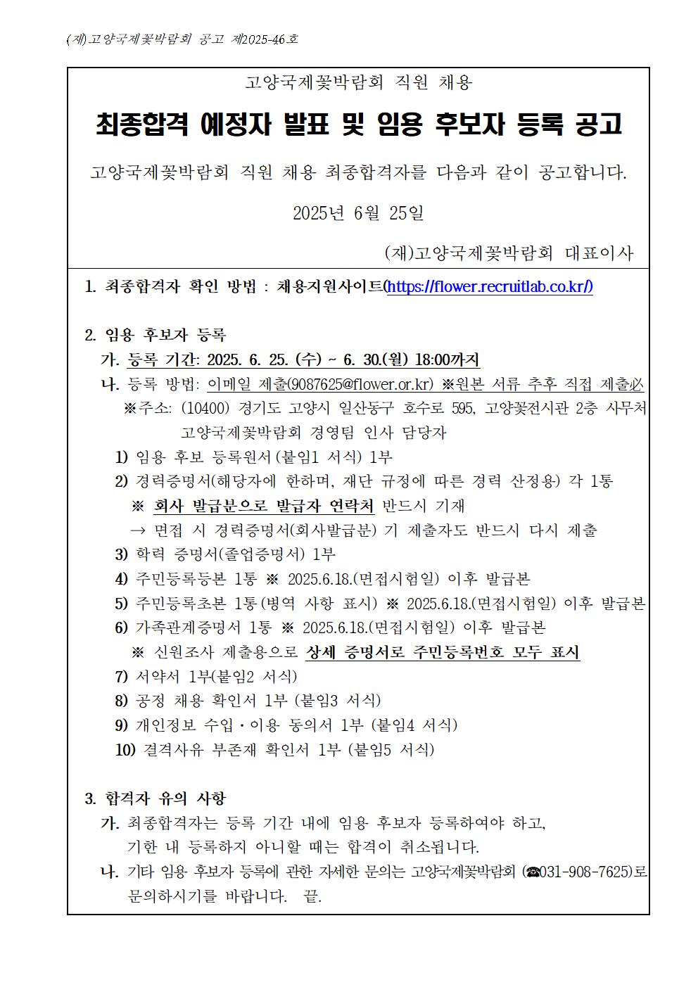 [공고] 2025년 고양국제꽃박람회 직원 채용 최종합격예정자 발표 및 임용후보자 등록 공고