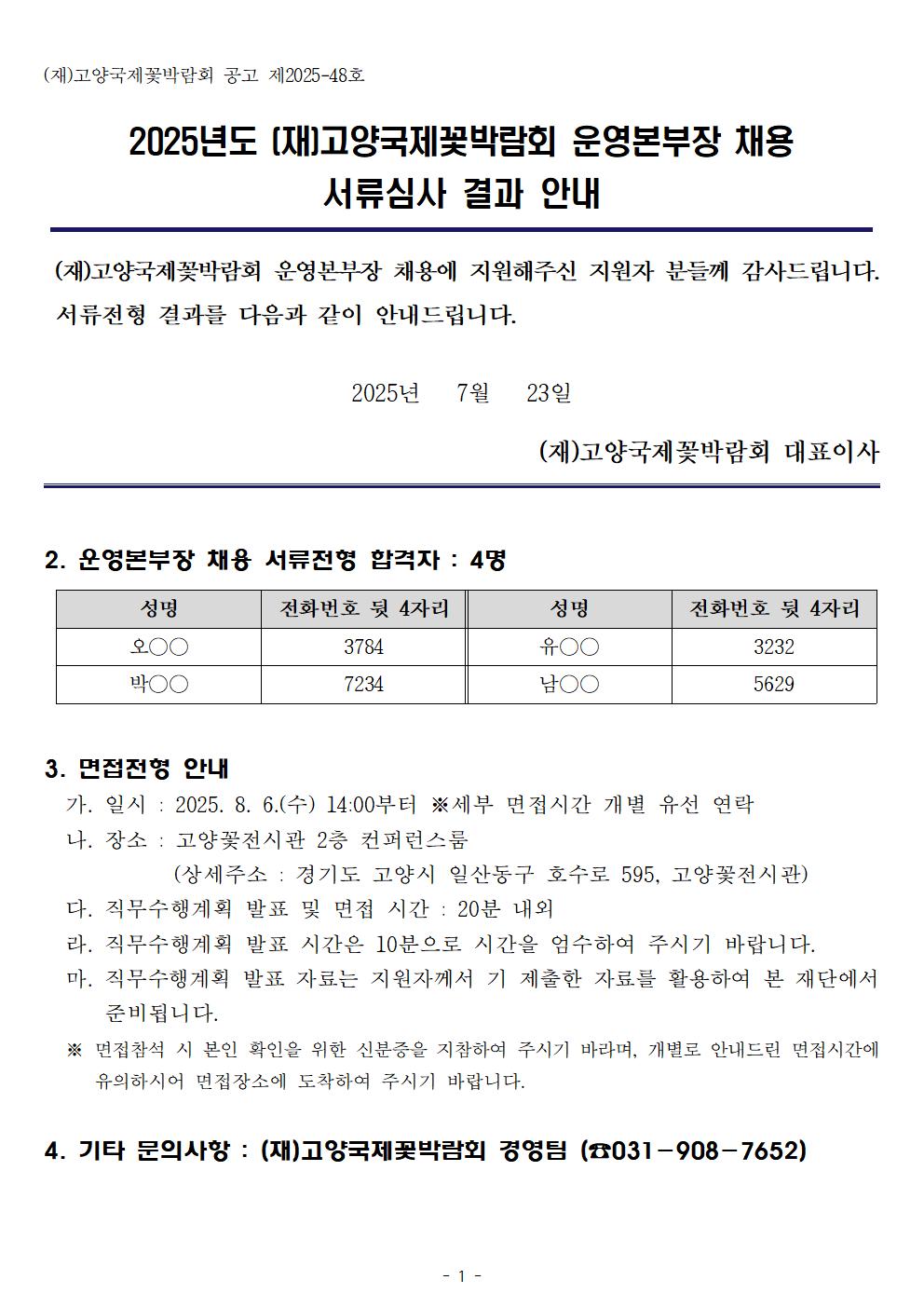 [공고]2025년도 운영본부장 채용 서류심사 결과 안내