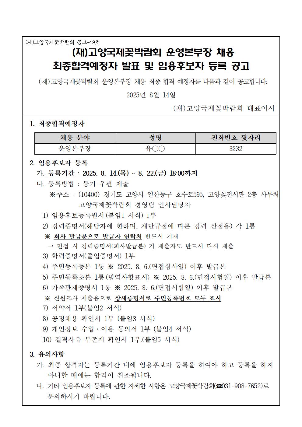 [공고]2025년도 운영본부장 채용 최종 합격 예정자 및 임용후보자 등록 공고